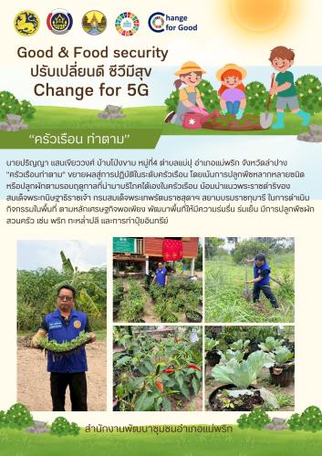 สำนักงานพัฒนาชุมชนอำเภอแม่พริก น้อมนำแนวพระราชดำริของสมเด็จพระกนิษฐาธิราชเจ้า กรมสมเด็จพระเทพรัตนราชสุดาฯ สยามบรมราชกุมารี สู่ปฏิบัติการปลูกผักสวนครัว เพื่อสร้างความมั่นคงทางอาหาร ประจำปีงบประมาณ พ.ศ. 2569 ภายใต้แนวคิด "ปรับเปลี่ยนดี ชีวีมีสุข" (Change For 5G Plus) “ครัวเรือนทำตาม” ครัวเรือนของ นายปริญญา แสนเขียววงศ์ บ้านโป่งขาม หมู่ที่4 ตำบลแม่ปุ อำเภอแม่พริก จังหวัดลำปาง และ ครัวเรือนของ นางสาววิยะดา โม้จันทร์ บ้านปางยาว หมู่ที่8 ตำบลแม่พริก อำเภอแม่พริก จังหวัดลำปาง ปลูกผักสวนครัวเพื่อสร้างความมั่นคงทางด้านอาหาร ประจำปีงบประมาณ พ.ศ.2569 ภายใต้แนวคิด "ปรับเปลี่ยนดี ชีวีมีสุข" (Chang For 5G Plus) "ครัวเรือนทำตาม" ครัวเรือนปลูกพืชผัก สวนครัว ปลูกพืชหลากหลายชนิดที่นำมาบริโภคได้เองในครัวเรือนส่งเสริมให้ครัวเรือน “ปลูกทุกอย่างที่กิน กินทุกอย่างที่ปลูก” ปลูกผักสวนครัว ได้แก่ พริก, กะหล่ำปลี, ผักสลัด, ผักชี, ต้นหอม