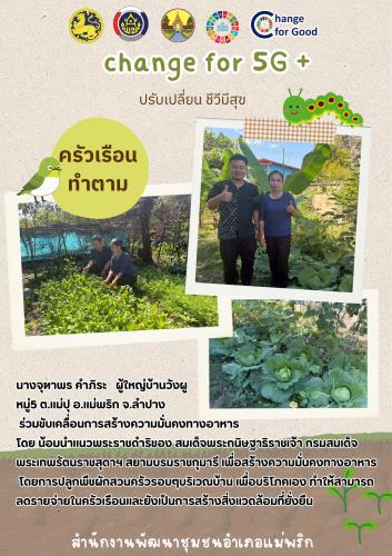 สำนักงานพัฒนาชุมชนอำเภอแม่พริกน้อมนำแนวพระราชดำริของสมเด็จพระกนิษฐาธิราชเจ้า กรมสมเด็จพระเทพรัตนราชสุดาฯ สยามบรมราชกุมารี สู่ปฏิบัติการปลูกผักสวนครัว เพื่อสร้างความมั่นคงทางอาหาร ประจำปีงบประมาณ พ.ศ. 2569 ภายใต้แนวคิด "ปรับเปลี่ยนดี ชีวีมีสุข" (Change For 5G Plus) “ครัวเรือนทำตาม” ครัวเรือนของ นางสมร เทือกคำชัน บ้านเด่นอุดม หมู่ที่5 ตำบลผาปัง อำเภอแม่พริก จังหวัดลำปาง และ ครัวเรือนของ นางจุฑาพร คำภิระ หมู่ที่5 ตำบลแม่ปุ อำเภอแม่พริก จังหวัดลำปาง ปลูกผักสวนครัวเพื่อสร้างความมั่นคงทางด้านอาหาร ประจำปีงบประมาณ พ.ศ.2569 ภายใต้แนวคิด "ปรับเปลี่ยนดี ชีวีมีสุข" (Chang For 5G Plus) "ครัวเรือนทำตาม" ครัวเรือนปลูกพืชผัก สวนครัว ปลูกพืชหลากหลายชนิดที่นำมาบริโภคได้เองในครัวเรือนส่งเสริมให้ครัวเรือน “ปลูกทุกอย่างที่กิน กินทุกอย่างที่ปลูก” ปลูกผักสวนครัว ได้แก่ พริก, กะหล่ำปลี, ผักสลัด, ผักชี, ต้นหอม